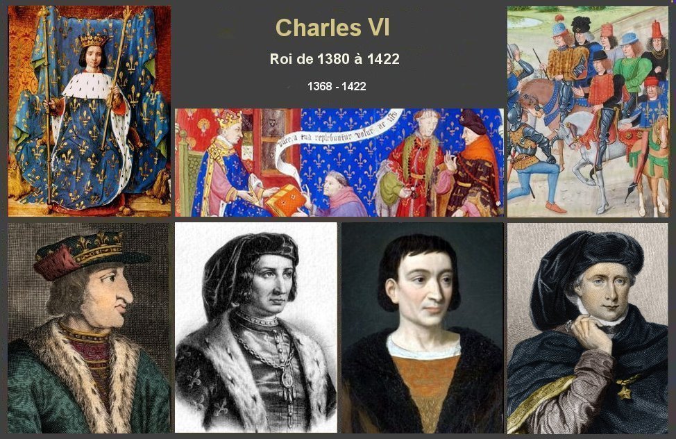 Brève biographie Charles VI, dit « le Fou » ou « le Fol » est né à Paris le 3 décembre 1368 à Paris C'est le fils du roi Charles V et de la reine Jeanne de Bourbon. L'argent manque, on multiplie les taxations, et le peuple se révolte : les maillotins parisiens assomment les percepteurs, au moment même où gronde la révolte communale en Flandre. Charles VI bat les Flamands révoltés à Rozebeke (1382) et soumet les villes rebelles : Rouen, Reims, Troyes, etc., et enfin Paris, qui perd plusieurs de ses anciens privilèges. Sous l'influence de Philippe le Hardi, le roi épouse Isabeau de Bavière, fille du duc Étienne II en 1385. D'abord placé sous la régence de ses oncles, les ducs de Bourgogne, d'Anjou, de Berry et de Bourbon, il décide en 1388, âgé de 20 ans, de s'émanciper. Charles VI reprend en main les affaires du royaume. Il chasse ses oncles prévaricateurs et rappelle les sages conseillers de son père, gens de modeste extraction que les princes surnomment avec mépris les « Marmousets ». Le jeune roi est alors appelé par ses sujets Charles VI le Bien-Aimé et le royaume entre dans une longue « embellie ». Mais Charles est frappé d'une première crise de folie en 1392. Vivant désormais dans des alternances de folie et de lucidité, il ne sera plus qu'un figurant. En 1420, après de nouveaux succès anglais et l'assassinat de Jean sans Peur, duc de Bourgogne, alors que les Bourguignons règnent en maître à Paris et s'allient aux Anglais, Charles VI signe avec ces derniers le traité de Troyes, par lequel il déshérite son fils, le futur Charles VII, et marie sa fille au roi d'Angleterre Henri V, qui devient son successeur. Charles VII meurt le 21 octobre 1422 à Paris