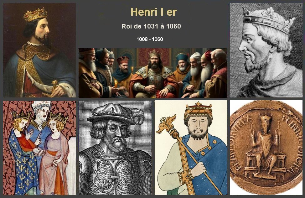 Brève biographie Henri Ier est né vers 1008 à Reims (Marne) Roi des Francs de 1031 à 1060, c'est le troisième roi de la dynastie des Capétiens Il est le deuxième fils de Robert II et de Constance d'Arles. Son nom, Henri, d’origine allemande, vint des Ottoniens, première dynastie régnante dans l’Empire germanique. Henri devient héritier de la couronne à la mort de son frère aîné Hugues, en 1025. Sacré roi du vivant de son père le 14 mai 1027 à Reims, il lui succède en 1031 mais doit faire face à l'hostilité de sa mère et des grands vassaux qui veulent élire au trône son frère cadet Robert. Son pouvoir, encore fragile, ne semblait porter que sur Paris et sur les vallées de l’Aisne et de l’Oise. L’autorité royale souffrait, sous le règne de Henri Ier, de l’émergence de puissants concurrents. Quasi-seigneur parmi d’autres, il faisait la guerre et s’alliait avec d’autres seigneurs en fonction de ses intérêts. Henri Ier doit donner en apanage la Bourgogne à son frère Robert, pour apaiser le mécontentement des grands seigneurs ralliés à la cause de son frère. En Normandie, il soutient en 1035 le duc Guillaume contre ses compétiteurs. Mais plus tard, il se brouille avec lui et Henri Ier est vaincu par le duc Guillaume, d'abord en 1054 et encore plusieurs fois les années suivantes. Après 1035, il épouse en premières noces Mathilde de Frise, nièce de l’empereur Conrad II Devenu veuf en 1044, et sans enfant légitime, Henri épouse le 19 mai 1051 Anne de Kiev d’origine macédonienne qui avait une ascendance byzantine Henri 1er est le père du roi Philippe Ier qu'il fait couronner roi de son vivant. Henri Ier meurt subitement le 4 août 1060 à Vitry-aux-Loges (Loiret)