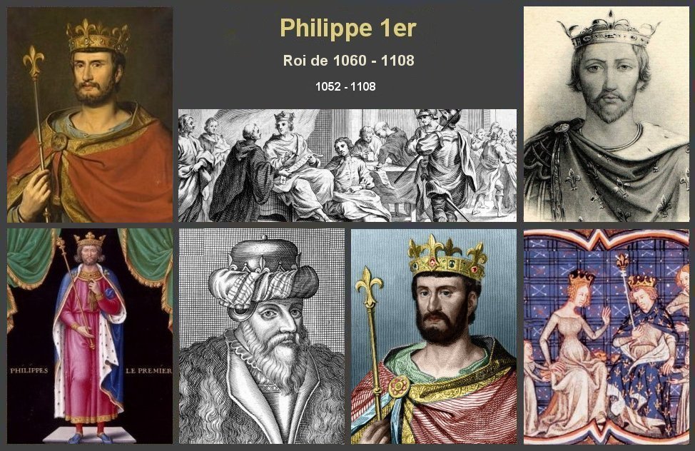 Brève biographie Philippe Ier est né le 23 mai 1052 Roi des Francs de 1060 à 1108, c'est le quatrième de la dynastie dite des Capétiens directs Il est le fils d’Henri Ier et d’Anne de Kiev. C'est à sa mère qu'il doit son prénom, courant dans le monde grec et orthodoxe Roi à huit ans en 1060, il va connaître l'un des règnes les plus longs de l'Histoire de France. Comme la succession héréditaire n'est pas encore entrée dans les mœurs, le jeune prince Philippe est associé au trône par son père dès l'âge de 7 ans et sacré à Reims le 23 mai 1059. Trop jeune et au demeurant peu intéressé par les affaires publiques, il laisse son puissant vassal Guillaume le Bâtard, duc de Normandie, conquérir la couronne d'Angleterre. La plus grande partie de son règne, Philippe Ier lutte pour réduire la puissance de son vassal le plus redoutable, Guillaume le Conquérant, duc de Normandie devenu roi d’Angleterre en 1066. En 1078, il prend parti pour Robert Courteheuse, le fils aîné de Guillaume, qui s'est révolté contre son père. Philippe s’entiche de Bertrade de Montfort, l’épouse de Foulques IV le Réchin. Il répudie alors Berthe de Hollande et se remarie avec Bertrade de Montfort le 27 mai 1092 16 octobre 1094, le concile d'Autun où sont réunis trente-deux évêques prononce l’excommunication du roi, le divorce étant prohibé et à plus forte raison le remariage du vivant de la première épouse, jugé comme un adultère Le pape Urbain II prêche la première croisade au concile de Clermont en 1095. Le roi excommunié ne peut participer à la croisade c'est son frère Hugues de Vermandois qui en sera l’un des principaux acteurs avec Godefroy de Bouillon. Philippe se réconcilie avec la papauté et il est absous en 1104 Philippe II meurt le 29 juillet 1108, au château de Melun (Seine et Marne) sans avoir pu empêcher le nouveau roi d'Angleterre, Henri Beauclerc, de réunir la Normandie à son royaume... Son fils Louis VI, qu'il avait initié aux opération militaires lui succède