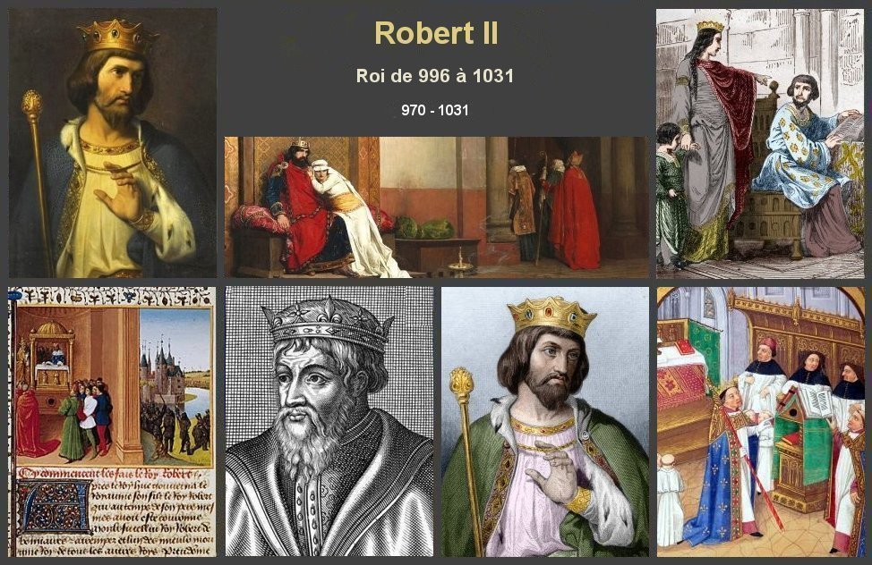 Brève biographie Robert II, surnommé « le Pieux » ou le « Sage » , est né à Orléans vers 972. Roi des Francs de 996 à 1031, c'est le deuxième de la dynastie des Capétiens Il est le fils d’Hugues Capet et de son épouse Adélaïde d'Aquitaine Robert II incarne l’idéal du roi médiéval : sage, lettré, pacificateur. Il est marié, en 988, par la volonté de son père à la veuve du comte de Flandres Rosala, de loin son ainée. Après l'avoir répudié, il se marie vec Berthe de Bourgogne Le pape rappelle à l’ordre Robert et Berthe pour « union incestueuse. Sans enfant, Robert II la quitte finalement avant d'épouser en1003, Constance d'Arles , issue de la haute noblesse provençale. Monté sur le trône en 996 , dès l’année 988, son père l’avait associé à la royauté du consentement des seigneurs. Visionnaire et conciliateur, il repoussa la couronne d’Italie, pacifia ses vassaux et gagna le respect des rois d’Europe Constance, femme ambitieuse et autoritaire, s’oppose à l’influence des conseillers cléricaux de Robert. Elle favorise l’ascension de ses propres partisans méridionaux à la cour, suscitant tensions et jalousies. Le Roi supporte ces avanies avec patience et courage, se réfugiant dans sa piété chrétienne. Robert II affermit son pouvoir en favorisant la paix de Dieu, en luttant contre les seigneurs pillards du domaine royal, en revendiquant systématiquement les fiefs contestés A partir de 1020, il y a une prolifération des châteaux privés ainsi que l’émergence de la chevalerie, nouvelle élite sociale qui tient son origine des cavaliers carolingiens. Le Roi institue la coutume du lavement des pieds des pauvres, cet usage se prolongera jusqu'à la Révolution Robert II meurt d’une fièvre accablante en 1031 à sa résidence de Melun (Seine et Marne Son fils Henri Ier fils de Constance d'Arles lui succédera