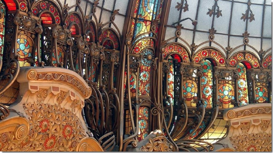 Le dôme de verre inspiré par le style byzantin, a 33 mètres de hauteur, est constituée de dix faisceaux de vitraux peints, enserrés dans une armature métallique richement sculptée de motifs floraux de style art nouveau . Les balustres des étages inférieurs, ornées de feuillages, sont signées Louis Majorelle, à qui l'on doit également la rampe d'escalier. Entre 1952 et 1956, les halls intérieurs sont supprimés et deux étages sont ajoutés. Au sommet du bâtiment, une terrasse permet de découvrir Paris.