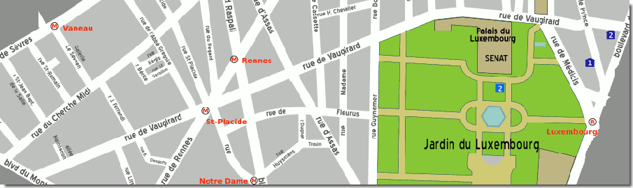 Le rue de Vaugirard, la plus longue de paris à une longueur de 4 300 m commence boulevard Saint Michel en face de la Sorbonne pour se terminer porte de Versailles. Elle passe devant le Théâtre de l'Odéon et le Sénat , puis longe les grilles du jardin du Luxembourg , coupe la rue Bonaparte qui mène à la place Saint Sulpice puis passe devant le couvent des Carmes et l'Institut Catholique de Paris