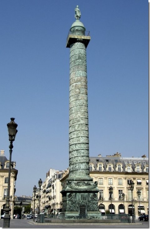 La colonne Vendôme a été érigée par Napoléon 1er afin de commémorer la bataille d'Austerlitz au centre de la place Vendôme. Son fût est constitué de 98 tambours de pierre recouverts de bronze provenant de 1 200 canons pris aux armées russes et autrichiennes. La statue de napoléon en César a été réalisée par Augustin Dumont (1801-1884) en 1863.