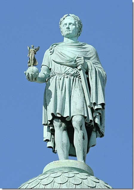 A l'origine, une statue de Napoléon coiffait la colonne, mais elle fut remplacée par un symbole royal, une fleur de lys, par les bourbons, après la défaite de l'empereur à Waterloo. Les trois statues de Napoléon La première statue de Napoléon en César fut réalisée par le sculpteur Antoine-Denis Chaudet (1763-1810). Elle a été placée au sommet de la colonne le 5 août 1810 sous la monarchie de Juillet. Descendue en 1814 elle est fondue en 1818. Seul le globe de la victoire fut préservé et fut plus tard installé sur la réplique de Dumont. La seconde statue a été réalisée par Charles Émile Seurre (1798-1858) y est placée au sommet de la colonne le 28 juillet 1833, en présence de Louis-Philippe. Napoléon III la fait remplacer en 1863 par une copie de la première statue en empereur romain de Chaudet, réalisée par le sculpteur Augustin Dumont (1801-1884) . L’ancienne statue est placée au centre du rond-point de Courbevoie. En 1911 elle est transférée dans la cour d'honneur de l'Hôtel des Invalides. Le peintre anarchiste Gustave Courbet, participa à sa chute provocatrice durant la Commune de Paris. Il fut lourdement condamné à la reconstruire et à la restaurer à ses propres frais. Inscription dédicatoire sur la base: « Napolio.Imp. Aug, Monumentum. belli. Germanici anno. m. d.cccv. (1805.) trimestri. spatio.ducto. suo. profligati. ex aere. capto. gloriae. exercitus. maximi dicavit » qui peut se lire : Napoléon empereur auguste, a consacré à la gloire de la Grande Armée, cette colonne, monument formé de l'airain conquis sur l'ennemi pendant la guerre d'Allemagne en 1805, guerre qui, sous son commandement, fut terminée dans l'espace de trois mois.