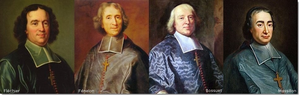 Bossuet, évêque de Meaux de Jean-Jacques Feuchère (1807-1852). Fénelon, archevêque de Cambrai (1843) de François Lanno (1800-1871). Massillon, évêque de Clermont de Jacques-Antoine Fauginet (1809-1847). Fléchier, évêque de Nîmes (1845) de Louis Desprez (1799-1870). Les lions, vases et armoiries sont de Jacques Auguste Fauginet.