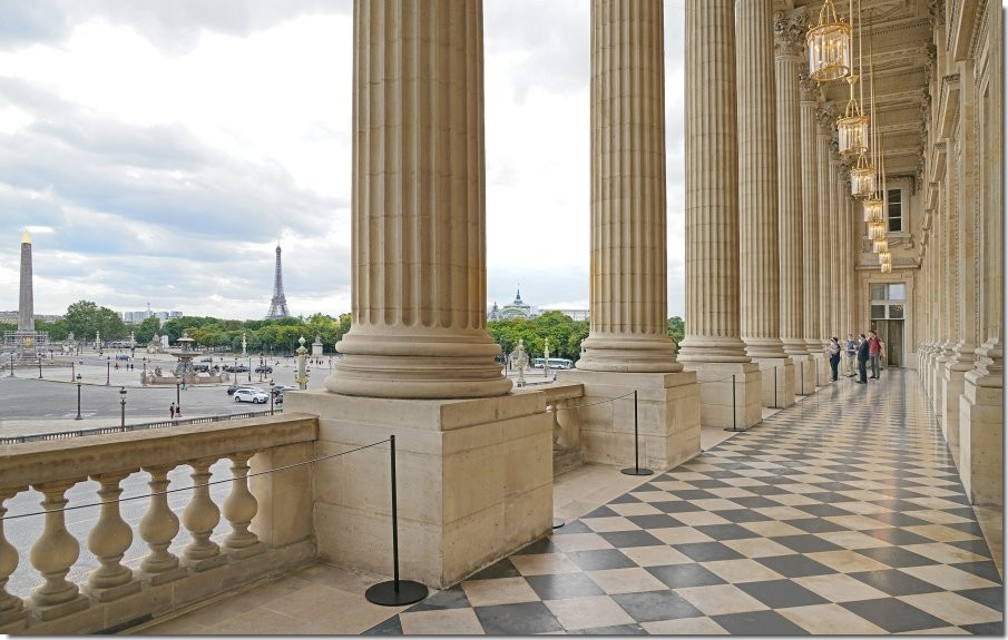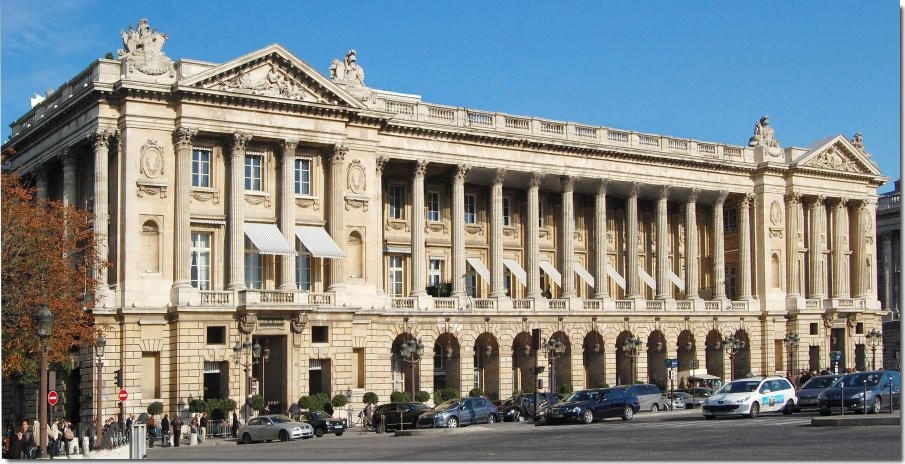 Entre 1766 et 1775 l’architecte Ange Jacques Gabriel (1698-1782) érige sur la place de la Concorde, deux palais aux façades monumentales séparés par la rue Royale. Dans la lignée de la colonnade de Perrault au Louvre. L'architecte du roi reprend non seulement la colonnade dressée sur un fort soubassement, mais aussi l'allure générale du bâtiment: grand entablement, pavillons d'angle, toiture en terrasse, médaillons ovales et guirlandes.