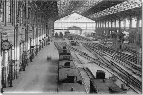la gare en 1900 - locomotives en gare - façade et cour intérieure