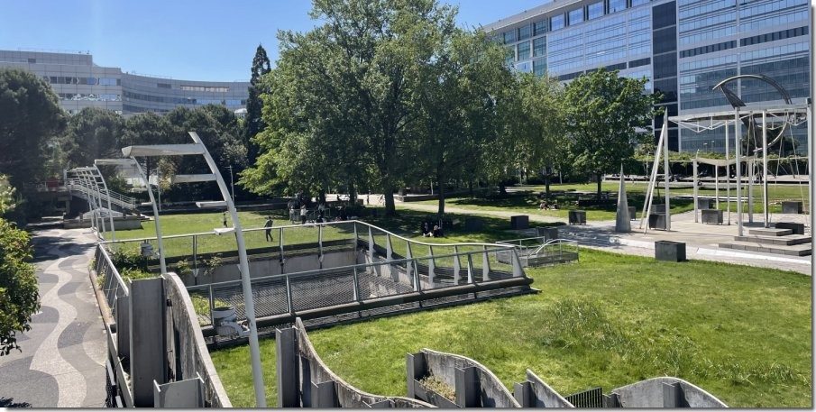 Traversée en son centre par une allée qui mène à la fontaine de l'île des Hespérides où l'on trouve un portique dont chaque pied héberge un équipement météorologique ( devenu hors service) et qui supporte un grand miroir orientable. La végétation persistante, ornant le parc, est empruntée à la nature des façades atlantiques des deux continents et offre outre le vert, du mauve, du blanc et du bleu.