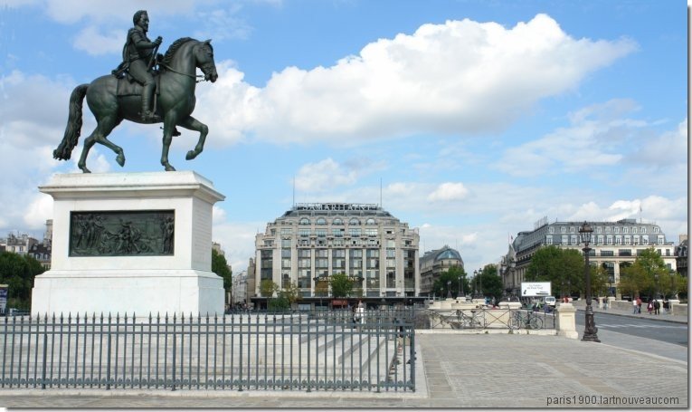 Le pont Neuf, d'une longueur de 140 m pour une largeur de 20,5 mètre, commencé en 1578 sous Henri III est achevé en 1604 sous le règne du Roi Henri IV. Il est contrairement à son nom, le plus ancien pont de Paris. Le pont Neuf relie le quai Conti sur la rive gauche au quai du Louvre sur la rive droite après avoir traversé la pointe ouest de l'île de la Cité et la place du Pont neuf devant le jardin du Vert Galant
