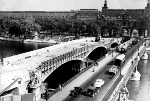 Le pont du Carrousel, d'une longueur de 168 mètres pour une largeur de 33 mètres, a été reconstruit de 1939 à 1943 en dos d'âne, sous la direction des ingénieurs Gaspard et Morane. Il est composé de cinq arches en béton armé recouvert d'un parement en en pierre de taille, trois travées au dessous de la Seine et deux situées sur les quais bas. Le pont du Carrousel relie le quai Voltaire sur la rive gauche au quai François Mitterrand et les Guichets du Louvre,