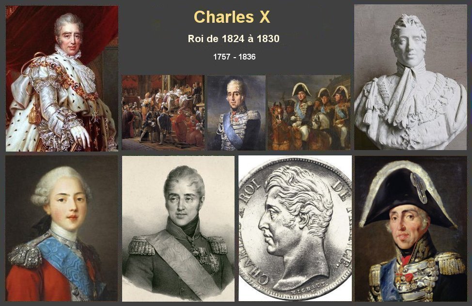 Brève biographie Charles X est né au château de Versailles à Versailles (Yvelines) le 9 octobre 1757 Il se marie avec Marie-Thérèse de Sardaigne (1756-1805) le 16 novembre 1773, dont il a deux fils. Durant le règne de son frère Louis XVIII, dont il est l'héritier, il prend la tête des royalistes les plus réactionnaires. En 1824, il succède à son frère, qui n'a pas eu d'enfants. Il se fait sacrer à Reims le 29 mai 1825, renouant ainsi avec les traditions de la monarchie absolue. Le début de son règne débute par quelques mesures libérales, mais il ne tarde pas rapidement à gouverner avec les Ultraroyalistes. Il favorise la noblesse et l'Église catholique. Il supporte mal d'avoir à partager la mise au point des lois avec les députés élus et les pairs nommés. Charles X, roi mécène, consacre le tiers du budget à l'achèvement des constructions publiques engagées sous le Premier Empire. La politique étrangère de Charles X vise à la restauration du prestige international et de la puissance de la France, qui avait été vaincue sous le règne de Napoléon 1e Les ordonnances de Juillet, inconstitutionnelles selon leurs opposants provoquent la réprobation de ces derniers. Ils soulèvent Paris les 27, 28 et 29 juillet : ce sont les Trois Glorieuses de 1830, ou « révolution de Juillet ». Le 2 août 1830, Charles X, retiré à Rambouillet, abdique et convainc son fils aîné le dauphin Louis-Antoine de contresigner l'abdication. Mais c'est son cousin Louis-Philippe d'Orléans qui est proclamé roi sous le nom de Louis-Philippe Ier . Le roi déchu se retire en Écosse, puis après avoir séjourné en Prague et en Autriche il décède le 6 novembre 1836 à Görz (Autriche) Son corps inhumé dans l'église de l'Annonciation du couvent de Kostanjevica à Nova Gorica (Slovénie) n'a jamais été ramené en France