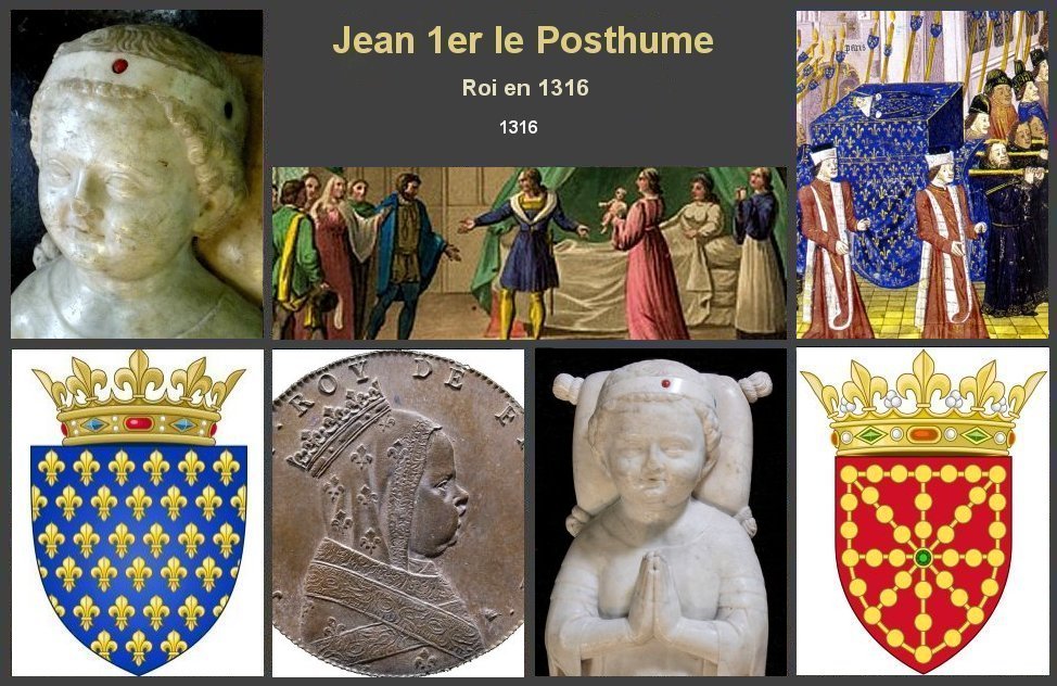 Brève biographie Jean Ier, dit « le Posthume » est né le 15 novembre 1316 Règne sous la régence de son oncle Philippe de Poitiers. Il est le treizième et le dernier roi de la dynastie dite des Capétiens directs Jean Ier est le fils posthume de Louis X le Hutin et de Clémence de Hongrie. Lorsque Louis X mourut le 5 juin 1316, la reine était enceinte de cinq mois. C’est Philippe, comte de Poitiers et frère du défunt roi, qui s’intitula alors régent du royaume jusqu’à la majorité du futur roi si la reine accouchait d’un fils. Le 15 novembre 1316 Clémence accoucha de Jean Ier, qui fut proclamé roi de France, Philippe gardant le titre de régent et se faisant attribuer celui de « gardien de l’état ». Jean ne vécut que cinq jours, sa mort le 19 novembre 1316 faisant de Jeanne II de Navarre, fille que Louis X le Hutin avait eu d’un premier mariage avec Marguerite de Bourgogne, l’héritière légitime du trône de France. Mais l’habitude prise depuis plus de trois siècles de voir le fils aîné du roi succéder à son père ayant fortement marqué les esprits, il était difficile d’envisager de laisser le royaume aux mains d’une femme. La question fut tranchée par des légalistes réunis dans une assemblée des grands le 2 février 1317, présidée par Pierre d’Arablay, chancelier de France. Il fut déclaré que la loi salique interdisait aux femmes de succéder au trône de France. Philippe de Poitiers fut proclamé roi de France sous le nom de Philippe V. Jean Ier est le dernier roi de la dynastie dite des Capétiens directs , le premier avait été Hugues Capet Diverses légendes circulèrent sur Jean Ier : on prétendit notamment que Philippe V l’avait fait empoisonner.