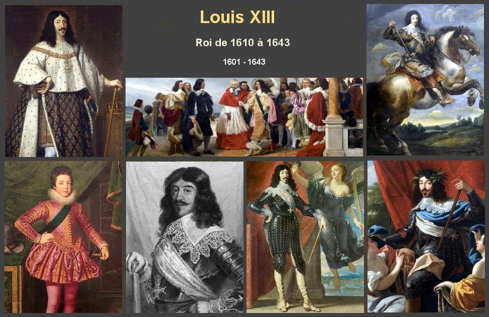 Brève biographie Louis XIII est né le 27 septembre 1601 au château de Fontainebleau (Seine et Marne) Il est le fils de Henri IV qui est roi de France et de Navarre et de Marie de Médicis. A l’âge de 9 ans Louis XIII devient roi, après le décès de son père père Henri IV. Trop jeune pour régner, commence une période de régence. Celle-ci est assurée par sa mère Marie de Médicis, qui laisse gouverner Concino Concini. Ce dernier est mal vu par Louis XIII, il le considère comme un usurpateur. La politique de Marie de Médicis et de Concini est catastrophique, la gestion de l’État est mauvaise. En 1615, Louis XIII est contraint de se marier avec Anne d’Autriche fille du Roi d’Espagne dans le but d'affirmer la chrétienté. Il aura deux fils : Louis XIV et Philippe d'Orléans . En 1617, Louis XIII fait assassiner Concini et laisse le pouvoir au duc Albert de Luynes. En 1624, Richelieu entre au Conseil des ministres comme partisan de la reine-mère. Rapidement il devient le principal ministre et se détache de la reine-mère. Richelieu réussit à réconcilier Louis XIII avec Marie de Médicis. Richelieu développe l'absolutisme en brisant, souvent par des exécutions capitales, les nobles qui conspirent ou refusent d'obéir. À partir de 1635, il entraîne la France dans la guerre de Trente Ans, qui l'oppose à l'Espagne et aux Autrichiens. Cette guerre sera désastreuse pour les finances royales. De nombreux soulèvements populaires auront lieu . Son règne est marqué par le renforcement de la monarchie absolue. Sur son lit de mort, Richelieu recommanda Mazarin au roi pour lui succéder en tant que ministre. Louis XIII meurt le 14 mai 1643 au château Neuf de Saint-Germain-en-Laye. Son règne a permis d’unifier le pays, et les administrations ont été fortement développées. Il laisse ainsi un royaume moderne.