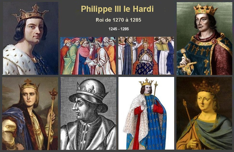 Brève biographie Philippe III dit « le Hardi », est né le 1er mai 1245 à Poissy (Yvelines Roi de France de 1270 à 1285, c'est le dixième souverain de la dynastie dite des Capétiens directs. Il est le second fils du roi de France Louis IX et de son épouse Marguerite de Provence. Cadet de famille, le prince Philippe n'était pas destiné à régner. C'est à la mort de son frère aîné Louis de France en 1260 qu'il devint prince héritier. Il épouse Isabelle d'Aragon en 1262, puis Marie de Brabant en 1274. Philippe fut donc proclamé roi sous le nom de « Philippe III » à Tunis. Très pieux, sans grande personnalité mais bon cavalier, il dut son surnom de « Hardi » à sa vaillance au combat plutôt qu'à sa force de caractère. Le nouveau souverain fut sacré roi de France à Reims le 15 août 1271 À l'intérieur, il poursuit l'œuvre administrative de son père (ordonnance de 1278). À l'extérieur, il soutient la politique de son oncle Charles d'Anjou Il subit tour à tour l'influence de ses conseillers Mathieu de Vendôme, abbé de Saint-Denis, et Pierre de La Brosse, et celle de sa deuxième épouse, qui obtiendra finalement l'élimination, puis la pendaison du second (1278). Philippe III, en accord avec la papauté, mène l'expédition dite « croisade d'Aragon » Après quelques succès sur terre, défaites en Espagne durant l'année 1985, l'armée est victime d'une épidémie Philippe III meurt le 5 octobre 1285 à Perpignan (Pyrénées-Orientales) Son fils Philippe IV lui succèdera