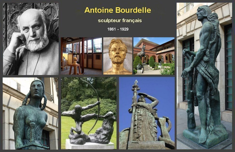 Brève biographie Antoine Bourdelle, sculpteur français, est né le 30 octobre 1861à Montauban (Tarn-et-Garonne) Il commence à étudier à l'Académie des Beaux-arts de Toulouse. En 1884 il entre à l' école des Beaux Arts , où il est l'élève d'Alexandre Falguière (1831-1900) Il s’installe en 1885 au 16,impasse du Maine (actuellement rue Antoine Bourdelle) transformé en 1949 en musée Antoine Bourdelle A partir de 1893 il fréquente l'atelier de Jules Dalou et fut le praticien d'Auguste Rodin, qui deviendra un ami fidèle. En 1909 Il commence à enseigner à l'Académie de la Grande Chaumière (Montparnasse) à de nombreux élèves comme, Alberto Giacometti, Aristide Maillol, René Iché, Germaine Richier Antoine Bourdelle, décédé au Vésinet le 1er octobre 1929, est enterré au cimetière du Montparnasse