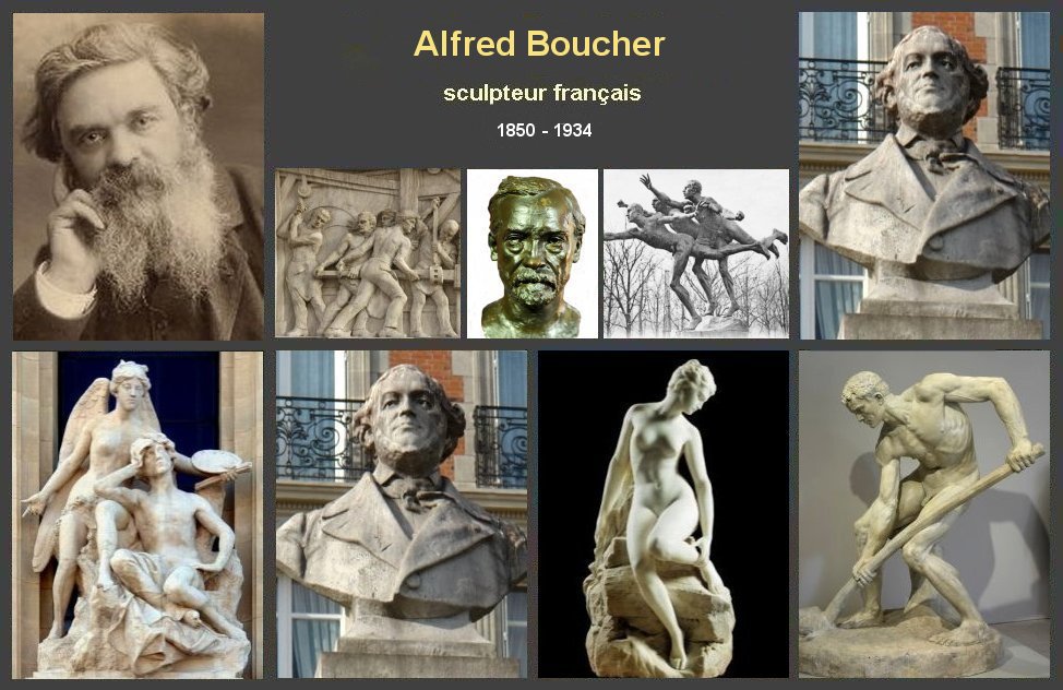 Brève biographie Alfred Boucher sculpteur français est né le 23 septembre 1850 à Bouy-sur-Orvin (Aube) Né dans une famille très modeste, il obtient des bourses pour ses études Alfred Boucher entre à l'École des beaux-arts de Paris en 1869 et suit les cours de Paul Dubois et d'Auguste Dumont. Il séjourne longuement en Italie par deux fois, en 1877-1878 et 1883-1884 . Boucher devient un des artistes français les plus sollicités par les commandes publiques et aborde avec succès différents sujets. Il s'installe à Aix-les-Bains en 1889 en conservant son atelier parisien, et honore de nombreuses commandes de monuments commémoratifs Au sommet de sa célébrité, il est couronné par le grand prix de sculpture de l'Exposition universelle de 1900. Il fonde, en 1902 à Nogent-sur-Seine, le musée Paul Dubois-Alfred Boucher, devenu musée Camille Claudel qui abrite un fonds de ses œuvres. Généreux et philanthrope il crée aussi, la même année, la cité parisienne de la Ruche pour aider les jeunes artistes en faisant aménager pour eux des ateliers dans le quartier du Montparnasse en récupérant un pavillon de l'Exposition universelle de 1900. Après la Grande Guerre, utilisant un nouveau matériau, le ciment armé, Boucher réalise encore, à la fin de sa vie, les monuments aux morts de Nogent-sur-Seine et d'Aix-les-Bains. Alfred Boucher reconnaît très vite le talent de Camille Claudel (1864-1943) Il préfère les thèmes poétiques en associant nature, nu féminin et mythologie Alfred Boucher est décédé le 18 août 1934 à Aix-les-Bains (Savoie)