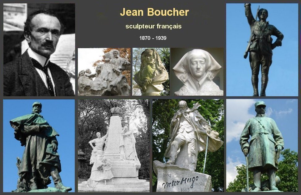 Brève biographie Jean Boucher sculpteur français est né le 20 novembre 1870 à Cesson-Sévigné (Ile et Vilaine) Il suit les cours de Pierre Lenoir, professeur à l'école régionale des Beaux-Arts de Rennes. Il est admis en 1889 à l’École des beaux-arts de Paris dans l'atelier d'Alexandre Falguière, puis dans celui d'Henri Chapu à l’Académie Julian en 1888. Il suit également les cours d'Antonin Mercié qu'il remplacera. Il obtient plusieurs récompenses dont le Second Grand Prix de Rome en 1898. Boucher est mobilisé pendant la Première Guerre mondiale comme sergent dans l’infanterie Il devient professeur à l'École des Beaux-Arts de Paris et membre de l'Institut Après la guerre, cherche à glorifier les soldats morts pour la France en réalisant de nombreux monuments. Il est élu à l’Académie des beaux-arts le 29 février 1936, en remplacement d'Hippolyte Lefèbvre. Jean Boucher est décédé le 17 juin 1939 à Paris