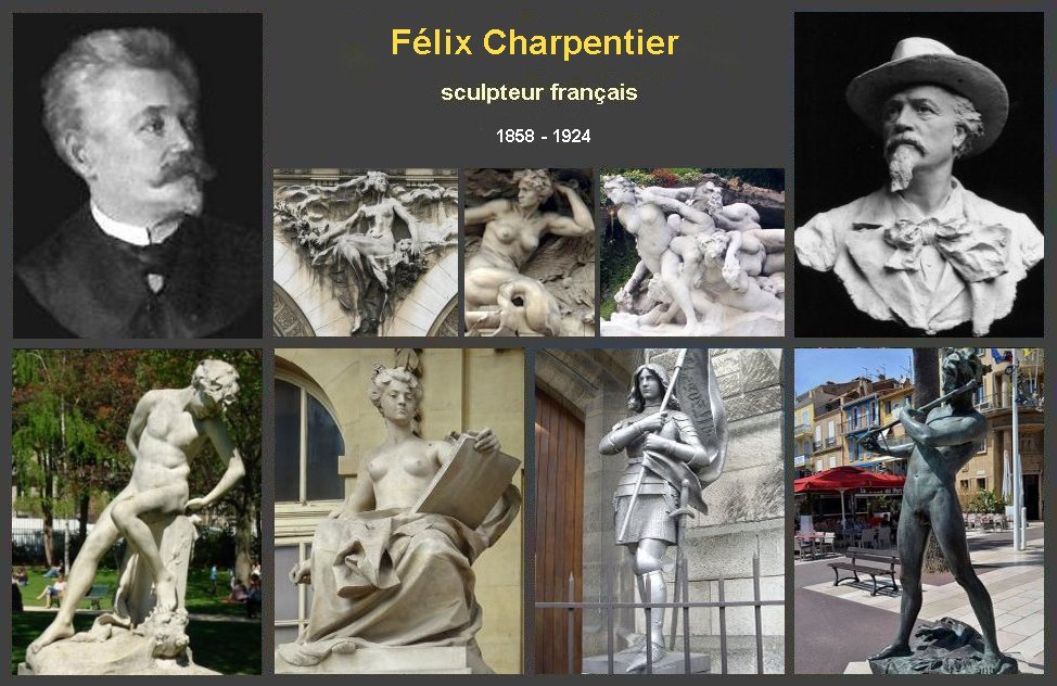 Brève biographie Félix Charpentier sculpteur français est né le 10 janvier 1858 à Bollène (Vaucluse) Son père est ouvrier briquetier dans une usine où il y travaillera en 1871 Elève de l’école des beaux-arts d’Avignon, il est admis en 1877 dans les ateliers de Jules Cavelier et d’Amédée Doublemard à l’École des beaux-arts de Paris Il est nommé chevalier de la Légion d'honneur en 1892, puis officier de la Légion d'honneur le 9 février 1901. Charpentier est élu maire de Chassant (Eure-et-Loir) en 1900 où il a élu domicile. Il a réalisé plus de 350 sculpture au cours de sa carrière. Félix Charpentier est décédé le 7 décembre 1924