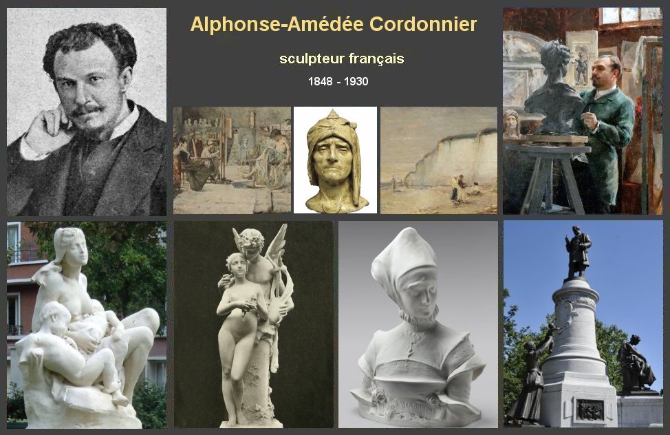 Brève biographie Alphonse-Amédée Cordonnier sculpteur français est né le 1er février 1848 à La Madeleine (Nord) Il fait ses études aux Écoles académiques de Lille. Il poursuit ses études à Paris à l'École des Beaux-arts où il suit les enseignements d'Auguste Dumont et de Gabriel-Jules Thomas Cordonnier séjourne à Rome de 1873 de 1877 comme pensionnaire de la fondation Jean-Baptiste Wicar. Il remporte le prix de Rome en 1877, puis retourne à Rome comme pensionnaire à la Villa Médicis de 1878 à 1881. Il reçoit aussi une médaille d'argent à l'exposition universelle de Paris de 1889 et une médaille d'or à l'exposition universelle de 1900. Sculpteur de style réaliste tendant vers la simplicité, Cordonnier exécute de nombreuses sculptures à caractère social. Il réalisa également des tableaux Il est nommé chevalier de la Légion d'honneur en juillet 1888 et promu officier en juillet 1903. Alphonse-Amédée Cordonnier est décédé le 27 octobre 1930 à Paris