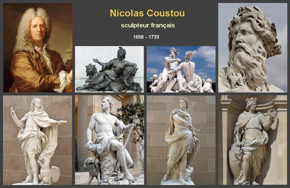 Brève biographie Nicolas Coustou, dit Coustou l'Aîné, sculpteur français, est né le 9 janvier 1658 à Lyon (Rhône) Il est le fils de Claudine Coysevox, sœur d'Antoine Coysevox, et de François Coustou, modeste sculpteur sur bois d'origine lyonnaise dont il suit d’abord l’enseignement. Nicolas Coustou est le frère aîné du sculpteur Guillaume Coustou et l’oncle du sculpteur Guillaume II Coustou. Il quitte Lyon en 1676 pour rejoindre son oncle Antoine Coysevox à Paris, où ce dernier dirige l'Académie royale de peinture et de sculpture. Coustou remporte le Prix de Rome en 1682. Il quitte Paris afin de poursuivre sa formation à l'Académie de France à Rome de 1683 à 1686. Coustou travaille aux grands chantiers de Louis XIV à Paris, Versailles et Marly. Il devient professeur à l’Académie en 1702, recteur en 1720 et chancelier de l’Académie en 1733. Nicolas Coustou est décédé le 1 mai 1733 à Paris Quelques œuvres Saint Louis sur la façade des Invalides 7e arr. Seine et Marne et chasseur au repos. groupes au musée du Louvre Louis XV en Jupiter au musée du Louvre La Saône bronze à Lyon (Rhône)
