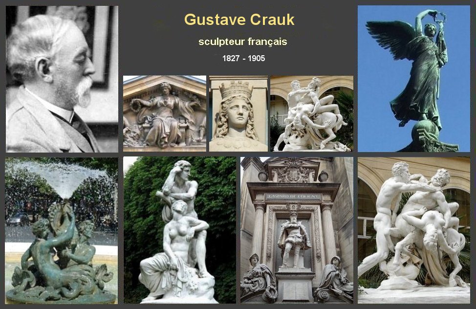 Brève biographie Gustave Adolphe Désiré Crauk sculpteur français est né le 16 juillet 1827 à Valenciennes (Nord) Il suit d'abord les cours de l'Académie de peinture et sculpture de Valenciennes avec Jean-Baptiste Carpeaux. Il est ensuite admis à l'École des beaux-arts de Paris en 1846, où il est l'élève de James Pradier (1790-1852) et d'Augustin Dumont (1801-1884) Il obtient le Prix de Rome de sculpture en 1851 pour le bas-relief en plâtre "Les Grecs et les Troyens se disputent le corps de Patrocle" Il séjourne ensuite à la Villa Médicis, à Rome jusqu'en 1856 il reçoit de nombreuses commandes de l'Etat ou de la ville de Paris Gustave Adolphe Désiré Crauk décédé, à Meudon, le 17 novembre 1905 est enterré à Valenciennes