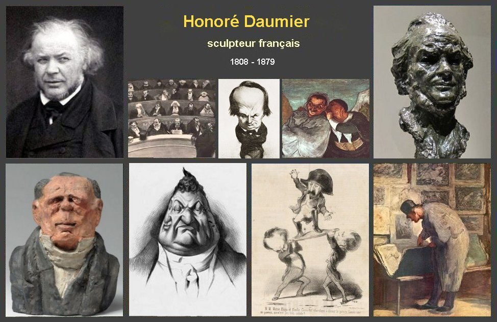 Brève biographie Honoré Daumier peintre et sculpteur français est né le 26 février 1808 à Marseille La plupart des toiles sont consacrées à des thèmes de la vie quotidienne. il est le fils d'un artisan verrier, poète amateur qui s'installa à Paris en 1816. Il travailla chez un huissier puis chez un libraire. Puis s'initia à la lithographie avant de fréquenter l'Académie suisse. Il publia ses premiers dessins humoristiques dans la Silhouette en 1829 et fut engagé dans le journal la Caricature. Il devint alors rapidement célèbre pour ses caricatures politiques au ton franchement irrévérencieux. Entre 1830 et 1835, il réalisa environ 1 000 gravures sur bois et 4 000 lithographies L'une d'elles, représentant le roi Louis- Philippe sous les traits du géant Gargantua de François Rabelais, lui valut en 1832 six mois d'emprisonnement. Il continua toutefois à caricaturer la société bourgeoise de façon féroce et bouffonne, exécutant une première série de petits bustes de notabilités politiques en argile qui de trouvent au musée d'Orsay. Suite à l'adoption des lois sur la censure en 1835, Daumier renonce à la satire politique pour se tourner vers la caricature de mœurs, avant de s'intéresser de nouveau aux hommes politiques après la Révolution de 1848. Admiré par Balzac , loué par Baudelaire , Daumier est considéré comme le plus grand caricaturiste français du XIXe siècle. Honoré Daumier est décédé à Valmondois (Val d'Oise) le 10 février 1879
