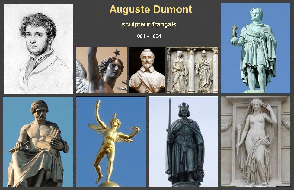 Brève biographie Augustin Alexandre Dumont, dit Auguste Dumont, sculpteur français, est né le 4 août 1801 à Valenciennes (Nord) Il est le fils du sculpteur Jacques-Edme Dumont (1761-1844) Il remporte le grand prix de Rome en sculpture de 1823, avec un bas-relief Douleur d'Évandre sur le corps de son fils Pallas avec Francisque-Joseph Duret Il est reçu à l'Institut de France en 1838 et enseigne à l'École des beaux-arts de 1853 à 1884 Augustin Dumont est décédé, à Paris le 28 janvier 1884