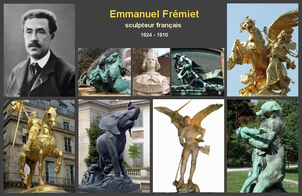 Brève biographie Emmanuel Frémiet sculpteur français est le 6 décembre 1824 né à Montrouge (Hauts de Seine) Principal représentant du réalisme rationaliste voire du naturalisme français de la seconde moitié du 19e siècle. Entre dans l’atelier de son oncle François Rude , après avoir fréquenté les cours du soir. Le thème à la mode de l'affrontement entre l'Homme et la Bête inspire Frémiet et d'autres artistes Il est élu membre de l'Académie des beaux-arts en 1892 Frémiet succède à Antoine-Louis Barye comme professeur de dessin animalier au Muséum d'histoire naturelle de Paris Il devient le statuaire officiel de la troisième République. Emmanuel Frémiet est décédé à Paris le 10 septembre 1910