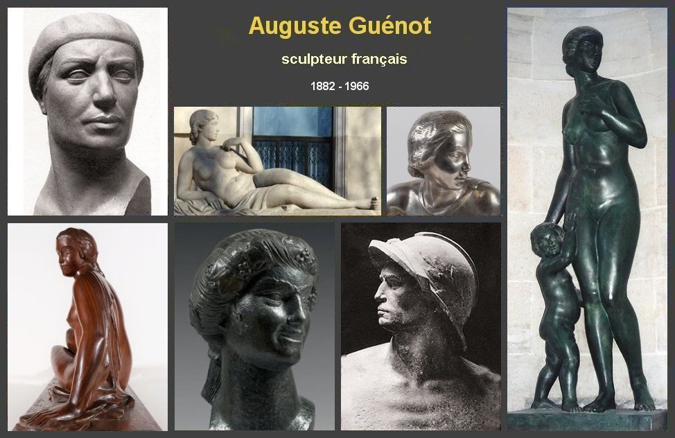 Brève biographie Auguste Guénot, sculpteur français, est né le 25 octobre 1882 à Toulouse (Haute-Garonne) Fils d'un père maître ébéniste, Il commence son apprentissage dans l’atelier paternel et se perfectionne chez divers artisans. En 1895, il est inscrit à l’École des beaux-arts, puis en 1899 il se rend à Paris. De retour à Toulouse, il est exempté du service militaire à cause d’un accident Il part en famille pour Paris fin 1919. Il participe aux Expositions internationales d’art décoratif, à l’Exposition coloniale de 1931 et à l’Exposition internationale de 1937 Auguste Guénot est décédé le 25 avril 1966 à Versailles (Yvelines)