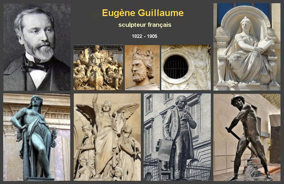 Brève biographie Eugène Guillaume sculpteur français est né le 4 juillet 1822 à Montbard (Côte-d'Or) Élève du sculpteur James Pradier, il remporte le premier grand prix de Rome en sculpture de 1845 avec une statue ayant pour sujet Thésée trouvant sur un rocher l'épée de son père. Il est nommé directeur de l'École des beaux-arts de Paris de 1864 à 1878, puis professeur de dessin à l'École polytechnique Professeur au Collège de France à partir de 1882, il dirige la Villa Médicis de 1891 à 1904. sculpteur de tradition classique, il s'inspire de l'art antique romain. Il dirige l'Académie de France à Rome entre 1891 et 1904 et est élu membre de l’Académie française en 1898 Eugène Guillaume, décédé à Rome (Italie) est inhumé au cimetière du Père-Lachaise le 1er mars 1905