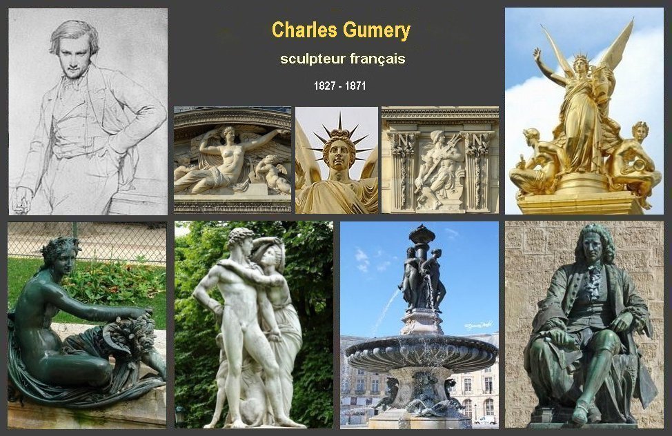 Brève biographie Charles Gumery sculpteur français est le 14 juin 1827 né à Vaugirard. Il obtient le prix de Rome de sculpture en 1850 avec la ronde-bosse "Achille blessé au talon par la flèche de Pâris" et devient pensionnaire à la Villa Médicis. Il devint l'un des sculpteurs les plus réputés du Second Empire. Il enseigne à l'École des beaux-arts de Paris. Gumery ayant déjà réalisé deux groupes pour l'Opéra de Paris, il lui est commandé une nouvelle version de la Danse, celle de J. B. Carpeaux ayant été jugée trop licencieuse. Mais cette version n'a été substituée, elle se trouve maintenant au musée d'Angers Il est fait chevalier de la Légion d'honneur le 29 juin 1867. Charles Gumery, décédé le 19 janvier 1871, est inhumé au Cimetière de Montmartre