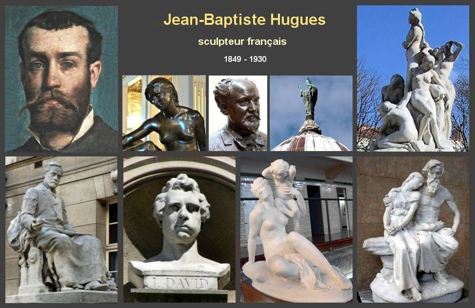 Brève biographie Jean-Baptiste Hugues sculpteur français est né le 15 avril 1849 à Marseille Il est l'élève d'Antoine Bontoux à l'École des Beaux-arts de Marseille, puis d'Auguste Dumont et de Jean-Marie Bonnassieux à Paris. Hugues obtient le Grand prix de Rome de sculpture en 1875 Il est pensionnaire à la villa Médicis à Rome de 1876 à 1879 Il obtient une médaille d’or aux Expositions universelles de 1889 et 1900 En 1897 il est nommé professeur de modelage à l'école nationale supérieure des beaux-arts Il est fait officier de la Légion d’honneur en 1903 Hugues travaille essentiellement pour des commandes de l'État ou de riches particuliers, Jean-Baptiste Hugues est décédé à Paris le 28 octobre 1930