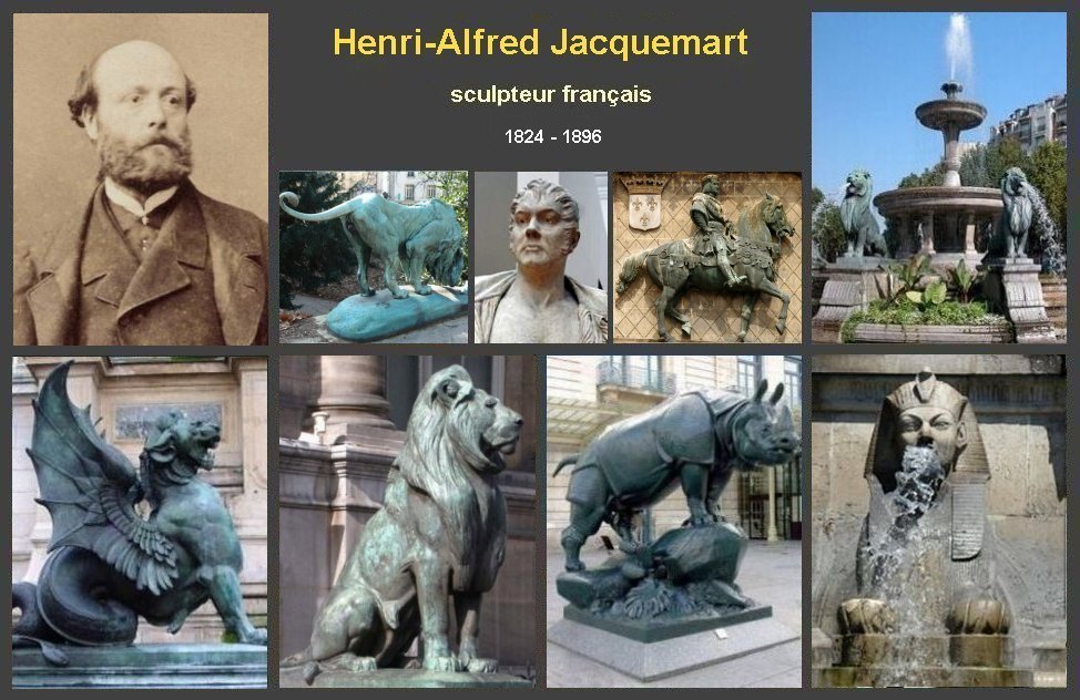 Brève biographie Henri-Alfred Jacquemart sculpteur français est le 24 février 1824 à Paris Fils d'un entrepreneur en serrurerie Il acquiert sa réputation grâce à la sculpture animalière, très prisée par la bourgeoisie à son époque . Il étudie à partir de 1845 à l'Ecole des Beaux-Arts de Paris . Il voyage en Egypte et en Turquie, pays qui deviendront pour lui une source d'inspiration. Le sculpteur reçoit de nombreuses commandes de l'Etat et de la Ville de Paris Jacquemart fait partie des sculpteurs, qui avec d'autres comme Pierre Louis Rouillard ou Antoine-Louis Barye ont profité, durant la seconde moitié du XIXe siècle, de l'engouement nouveau pour les sculptures d'animaux, Henri-Alfred Jacquemart est décédé à Paris le 4 janvier 1896