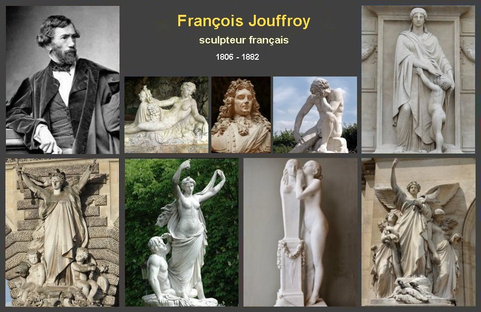 Brève biographie François Jouffroy sculpteur français est né le 1er février 1806 à Dijon (Côte d'Or) Fils d'un boulanger, Il est admis à l'École des beaux-arts de Paris en 1824 où il dispense un enseignement académique. Il obtient le prix de Rome en 1832 pour son "Canapée foudroyé sous les murs de Thèbes". Jouffroy est élu membre de l'Académie des beaux-arts en 1857. Puis est nommé professeur à l'Ecole des Beaux-arts de 1864 à 1882 François Jouffroy est décédé à Laval le 25 juin 1882.