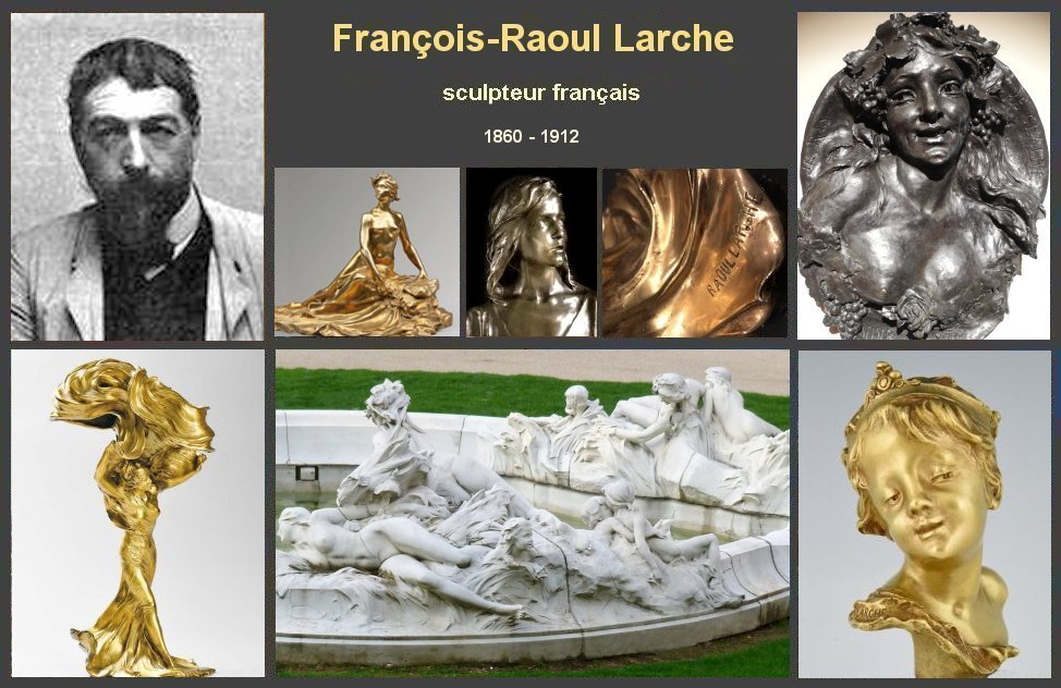 Brève biographie François-Raoul Larche, dit Raoul Larche, sculpteur, est né le 22 octobre 1860 à Saint-André-de-Cubzac (Gironde) Après une bref passage à l'Ecole supérieure des Arts Décoratifs, est admis à l’Ecole des Beaux-arts. Il y suit l’enseignement de François Jouffroy, Augustin Dumont, Alexandre Falguière, Jean Léon Gérôme et Eugène Delaplanche. Il remporte le deuxième prix de Rome en 1886 Son œuvre est représentative des styles néo-baroque et Art nouveau. Il crée aussi de nombreux objets d’art et pièces décoratives en bronze et en étain Il débute au Salon en 1884 et y participe régulièrement jusqu’en 1911. Il reçoit une médaille d’or à l’Exposition universelle de 1900 et une médaille d’honneur en 1910. Il est promu officier de la Légion d’honneur le 16 mai 1910. Il meurt, à cinquante deux ans, écrasé par une voiture aux environs de Lagny (Seine et Marne). Sa veuve proposa de faire donation d'œuvres de son mari à la ville de Bordeaux à condition qu'une salle Raoul-Larche soit créée dans le musée des beaux-arts. Cette salle, inaugurée le 5 décembre 1921, a été supprimée au début des années 1930,l'Art nouveau était totalement tombé en disgrâce aux yeux des conservateurs de musée. La totalité des pièces de l’atelier de Raoul Larche est mise en vente à l’hôtel Drouot le 14 juin 1937. Raoul Larche est décédé le 3 juin 1912 à Paris