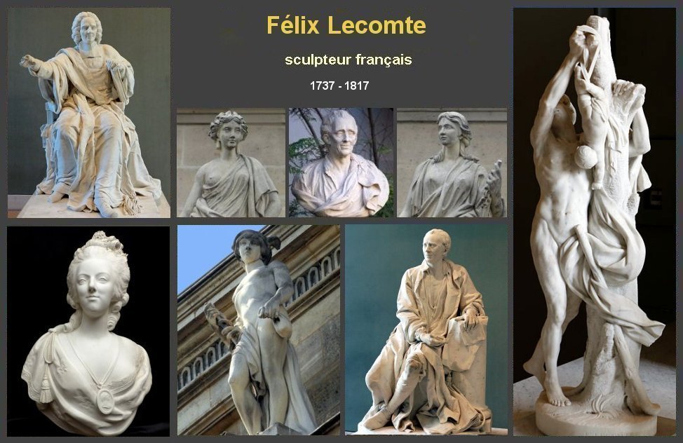 Brève biographie Félix Lecomte, sculpteur français, est né le 16 janvier 1737 à Paris Il est l'élève d'Étienne Maurice Falconet et de Louis Claude Vassé Il remporte le premier prix de sculpture en 1758 et entre à l'École royale des élèves protégés. Pensionnaire de la villa Médicis à Rome de 1761 à 1768, il est, dès son retour à Paris, agréé par l'Académie. Il devient lui-même académicien en 1771 Il est nommé professeur à l'École des beaux-arts de Paris en 1792 Il devient membre de l’Institut en 1810. Félix Lecomte est décédé le 11 janvier 1817 à Paris