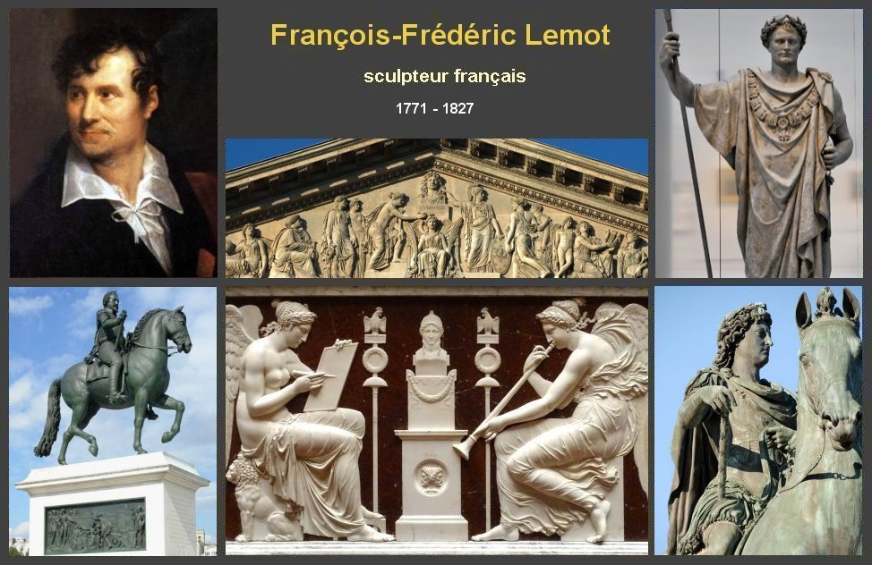 Brève biographie François-Frédéric Lemot, sculpteur français, est né le 4 novembre 1771 à Lyon (Rhône) Doté d'une aptitude peu commune pour le dessin il l'étudie à Besançon. A Paris il suit l’enseignement de Claude Dejoux à l’Ecole des Beaux-arts. Il remporte à dix-huit ans, le Prix de l’Académie Royale Il séjourne trois année à la Villa Médicis avant de rejoindre l’armée du Rhin. Lemot reçoit des commandes pour des réalisations généralement monumentales et de style néo-classique sous l'Empire Il est professeur à l'École des Beaux-Arts de 1810 à sa mort Il est décoré de la Légion d'honneur en 1826. François-Frédéric Lemot est décédé à Paris le 6 mai 1827 à Paris