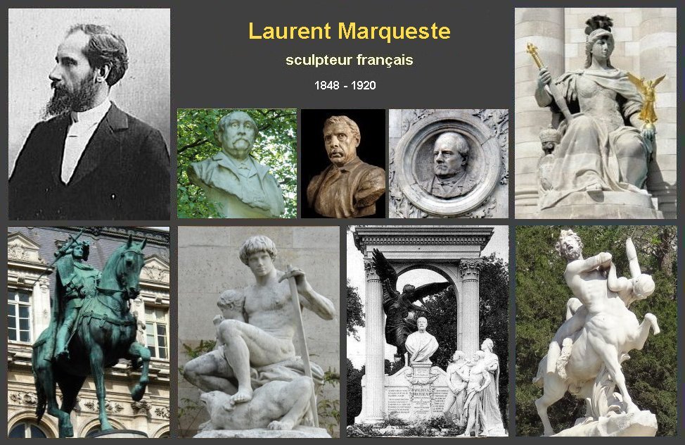 Brève biographie Laurent Honoré Marqueste sculpteur français est né le 12 juin 1848 à Toulouse Élève de l'école des beaux-arts de Toulouse Il est admis dans les ateliers de François Jouffroy et d'Alexandre Falguière à l'École des beaux-arts de Paris. Il obtient le prix de Rome en 1871 pour La Flagellation du Christ et devient pensionnaire à la villa Médicis à Rome de 1872 à 1875. Il enseigne à partir de 1893 à l'École des beaux-arts de Paris, et entre à l’Académie des beaux-arts en 1900. Il reçoit des commandes de la Ville de Paris, il réalise des allégories, des groupes mythologiques et des portraits historiques. Laurent Marqueste est décédé, à Paris le 5 avril 1920