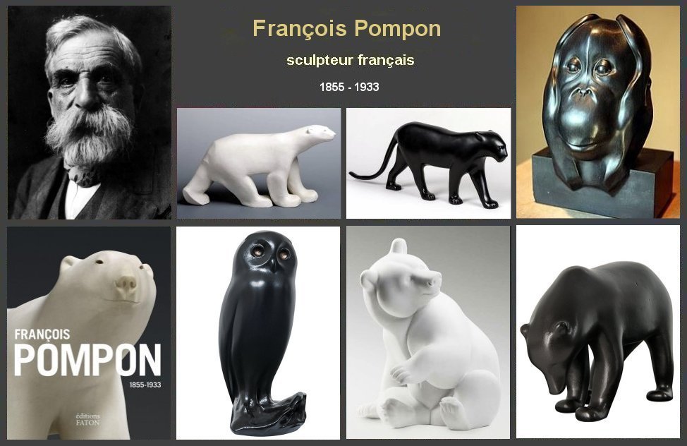 Brève biographie François Pompon, sculpteur français, est né le 9 mai 1855 à Saulieu (Côte-d'Or) Il entre comme apprenti dans l'atelier de son père, Alban Pompon (1823-1907) qui était compagnon du devoir menuisier-ébéniste. En 1870, il part, pour Dijon où il devient apprenti tailleur de pierre chez un marbrier. Il suit les cours du soir de la Petite École, future École nationale des arts décoratifs. Ses professeurs sont les sculpteurs Aimé Millet et Pierre Louis Rouillard. En 1890, Pompon entre dans l'atelier d'Auguste Rodin, où il travaille comme praticien au dépôt des marbres où il fera la connaissance d'Ernest Nivet et de Camille Claudel En 1905, il fait le choix définitif de ne travailler que des animaux en simplifiant la forme de ses sculptures. Polissant les surfaces et supprimant les détails. Ce n'est qu'à partir de 1922 que François Pompon connaît une célébrité tardive en envoyant l’Ours blanc au Salon d'automne de cette année-là, où son œuvre tranche par son modernisme sur l'esthétique de la sculpture réaliste héritée du XIXe siècle François Pompon meurt seul, veuf et sans descendance, le 6 mai 1933 à Paris suite à une maladie