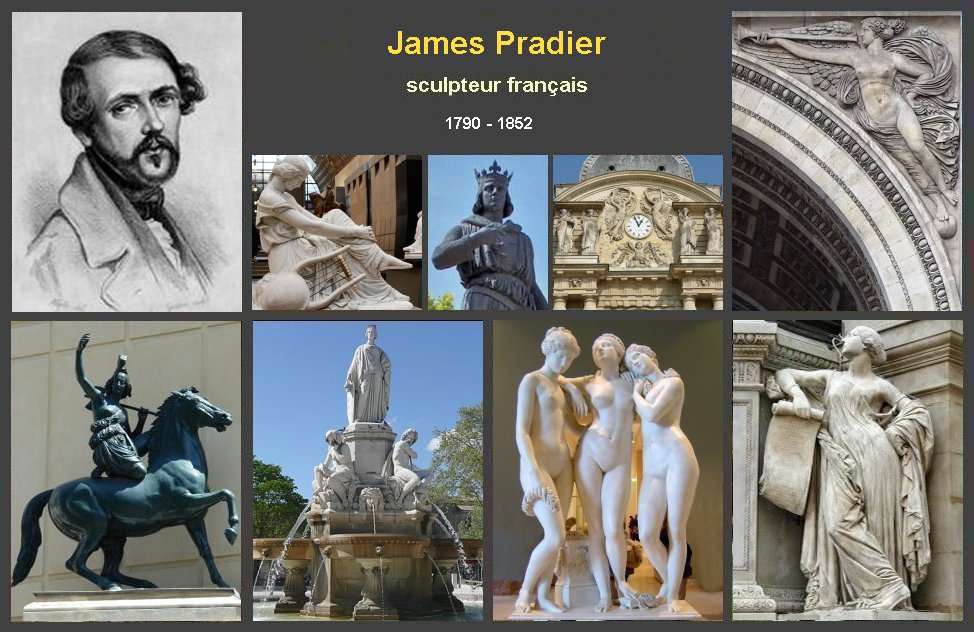 Brève biographie Jean-Jacques (dit James) Pradier sculpteur français est né le 23 mai 1790 à Genève (Suisse) Sa famille genevoise issue de réfugiés protestants originaires du Languedoc, la fratrie compte un graveur et 2 peintres. Il adopte le prénom anglophone de « James ». Il remporte le grand prix de Rome de 1813 en sculpture pour son bas-relief Néoptolème empêche Philoctète de percer Ulysse de ses flèches. Séjourne plusieurs années à la Villa Médicis, à Rome Il est nommé professeur à l'Ecole des Beaux Arts, officier de la Légion d'Honneur D'une grande notoriété, il obtient de nombreuses commandes officielles. Sculpteur néoclassique, il est influencé par le courant romantique et un art élégant et sensuel. Pradier est inhumé à Paris au cimetière du Père-Lachaise Jean-Jacques (dit James) Pradier est décédé à Paris le 4 juin 1852
