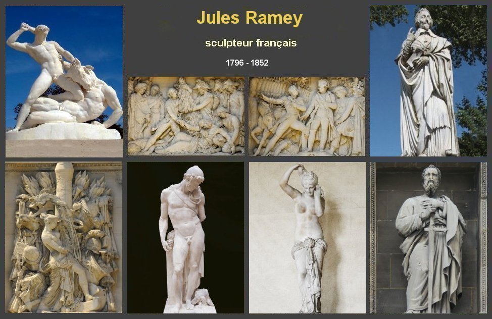 Brève biographie Jules Ramey, sculpteur français, est né le 24 mai 1796 à Paris Elève de son père, le sculpteur Claude Ramey, il est admis à l'École des beaux-arts de Paris dans l'atelier de Pierre Cartellier Ramey remporte le grand prix de Rome de sculpture en 1815, après avoir obtenu le second grand prix l'année précédente Il séjourne alors cinq ans à la Villa Médicis de Rome. Il débute au Salon de 1822 Devenu enseignant, il remplace en 1832 Pierre Cartellier à l'École des beaux-arts de Paris Il ouvre un atelier réputé avec le sculpteur Auguste Dumont Il entre à l’Académie en 1828. Ramey est nommé professeur à l’Ecole des Beaux-arts en 1832. Jules Ramey est décédé le 29 octobre 1852 à Paris