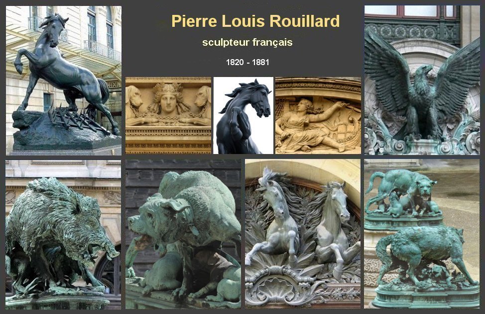 Brève biographie Pierre Louis Rouillard sculpteur français est né le 16 janvier 1820 à Paris Il est issu d'une famille d'artisans et de sculpteurs décorateurs Il entre en 1832 à l'École royale gratuite de dessin et de mathématiques (l'actuelle École nationale supérieure des arts décoratifs de Paris) Il est admis à l'Ecole des Beaux-arts de Paris en 1837 Rouillard est un sculpteur animalier qui privilégie les œuvres monumentales réalisées en pierre, bronze ou fonte de fer qu'il traite de manière académique. Il réalise des sculptures pour de nombreux châteaux et les grands décors parisiens du XIXe siècle (Opéra et Palais du Louvre) Barye fait partie des sculpteurs, qui avec d'autres comme Antoine-Louis Barye ou Henri-Alfred Jacquemart ont profité, durant la seconde moitié du XIXe En 1840, il est nommé professeur de sculpture et d'anatomie à l'École de dessin et de mathématiques. Pierre Louis Rouillard, décédé le 12 juin 1881 à Paris est enterré à Issy les Moulineaux