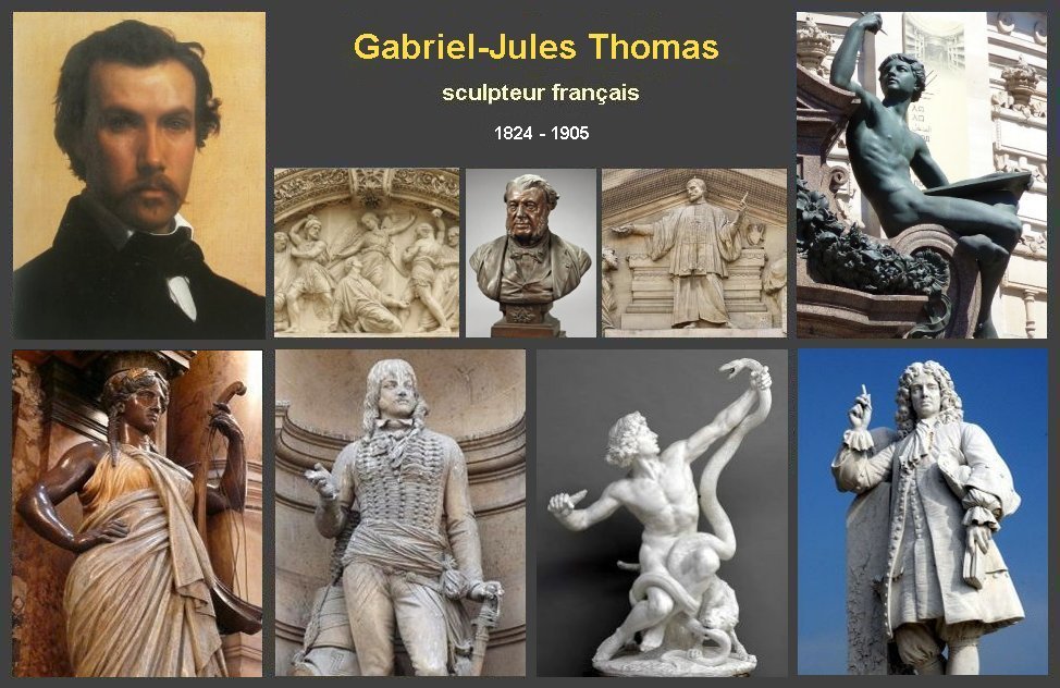 Brève biographie Gabriel-Jules Thomas sculpteur français est né le 10 septembre 1824 à Paris Il entre à l’Ecole des Beaux-arts en 1841 où il est élève d'Etienne Jules Ramey et d'Augustin Dumont, Il remporte le Prix de Rome en 1848 Après son séjour à la Villa Médicis, il participe pour la première fois au Salon de Paris de 1857 Thomas reçoit de nombreuses commandes publiques tout au long de sa vie d’artiste. Il reçoit de nombreuses médailles notamment à l'Exposition universelle de 1867 et l'Exposition universelle de 1889. Gabriel-Jules Thomas reçoit de nombreuses médailles aux Salons de Paris et aux Expositions universelles de 1867, 1881 et 1889 où il reçoit une médaille d'or. Il entre à l'Académie des Beaux-arts en 1875 et devient professeur de 1884 à 1891. Gabriel-Jules Thomas est décédé le 8 mars 1905 à Paris 6e