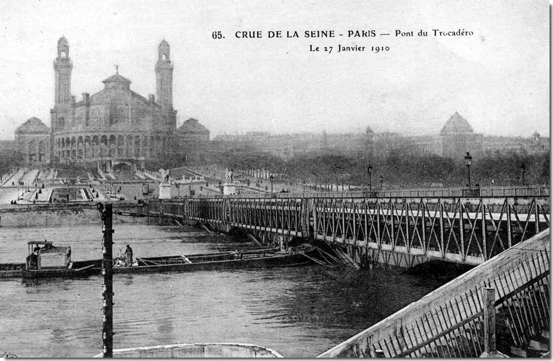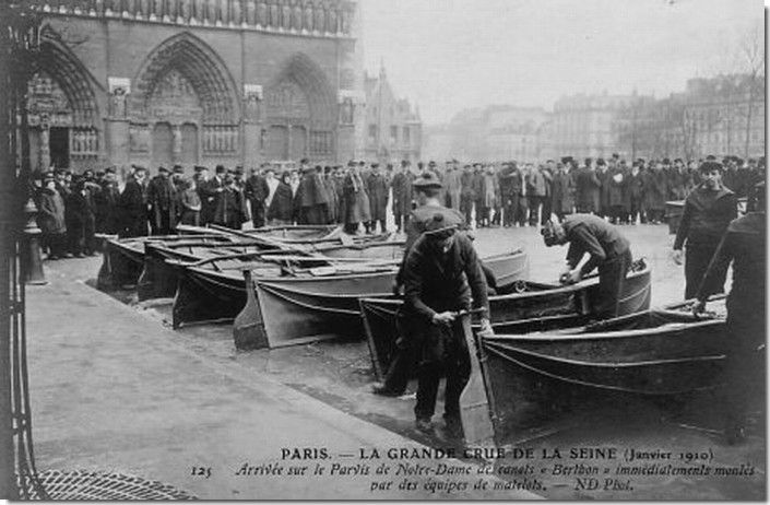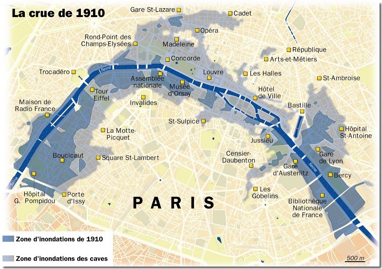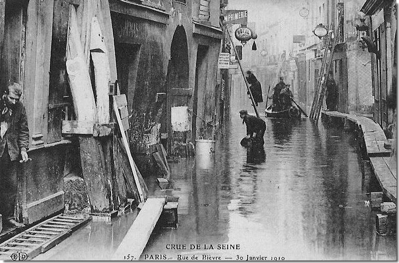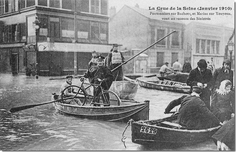 En janvier 1910, Paris connaît l'une des plus importantes crues de la Seine de son histoire. Commencée le 21 janvier, la crue atteint son maximum le 28 janvier au pont de la Tournelle, avec une cote de 8, 50 mètres. La moitié de la ville est inondée et plus de 200 000 parisiens sont sinistrés.