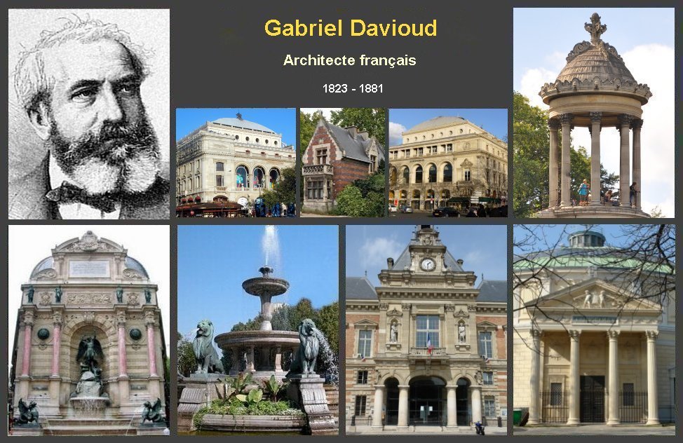 Brève biographie Gabriel Davioud architecte français est le 30 octobre 1823 à Paris Cet architecte, représentant de l'éclectisme architectural en vogue sous Napoléon III, fut l'un des collaborateurs d'Haussmann. Premier Prix de Rome, il est nommé inspecteur des travaux d’architecture de la ville de Paris et architecte en chef des promenades et des plantations. Il collabore avec Jules Bourdais pour certaines réalisations Il est chargé notamment de réaliser le mobilier urbain (kiosque, banc, poubelle, maisons de jardiniers, de gardes, lampadaires, grilles, fontaine…) Gabriel Davioud est décédé à à Paris le 6 avril 1881