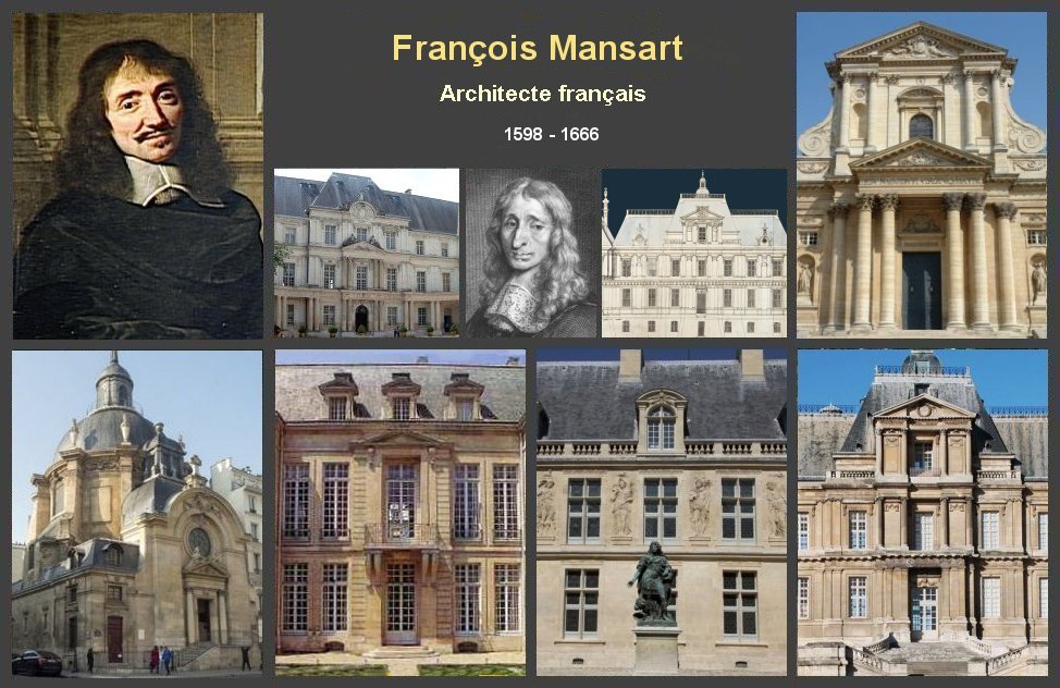 Brève biographie François Mansart architecte français est né le 23 janvier 1598 à Paris Il est issu d'une famille modeste d'artisans du bâtiment. Mansart effectue une période d'apprentissage auprès de son beau frère, Germain Gaultier qui était sculpteur et architecte de la ville de Rennes. Il travaille pour le frère du Roi et la haute noblesse d'épée, pour des secrétaires d'état, pour un ambassadeur etc. Le style de Mansart comprend des volumes pyramidant et des toits écrêtés. François Mansart est précurseur de l'architecture classique en France François Mansart décède à Paris le 23 septembre 1666.