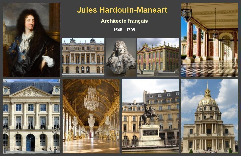 Brève biographie Jules Hardouin-Mansart architecte français est né le 16 avril 1646 à Paris Né dans une famille de peintres et de sculpteurs, originaire de Beauvais, il s'installe à Paris sous Henri IV Jules Hardouin-Mansart est le petit-neveu de l'architecte François Mansart et le beau-frère de Robert de Cotte Elève de l'architecte Libéral Bruand Jules Hardouin-Mansart est nommé premier architecte du roi Louis XIV en 1681 et surintendant des bâtiments du roi en 1685, après la décès de Louis Le Vau en 1670. Il a créé les symboles de la puissance de Louis XIV en incarnant le classicisme français Jules Hardouin-Mansart décède à Marly-le-Roi (Yvelines) le 11 mai 1708.