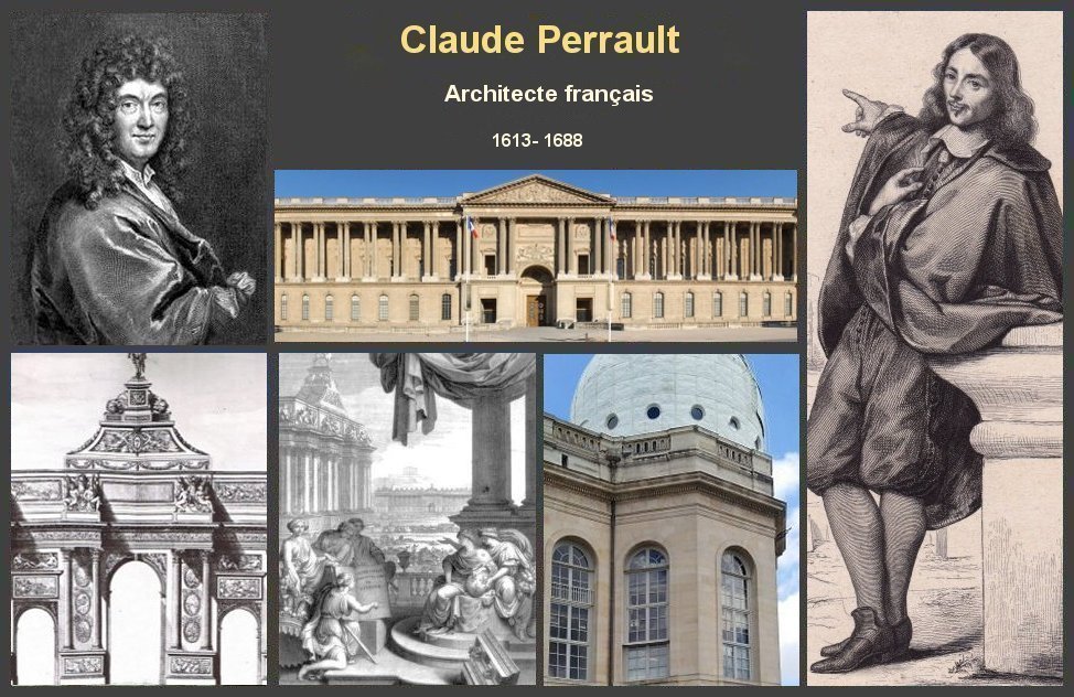 Brève biographie Claude Perrault architecte français est né le 25 septembre 1613 à Paris Il est né dans une famille de la bourgeoisie parisienne aisée, originaire de Tours Claude Perrault commence par étudier la médecine à la faculté de Paris, il est reçu docteur en 1641. Il est l’un des premiers membres de l’Académie royale des sciences en 1666. En 1673 il publie une traduction de Vitruve, architecte romain du 1e siècle av. J-C Claude Perrault décède à Paris le 9 octobre 1688