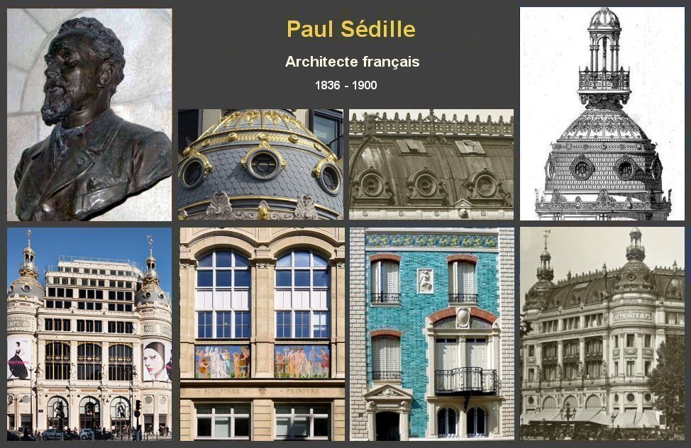 Brève biographie Paul Sédille, architecte français, est né le 16 juin 1836 à Paris Fils de l’architecte Charles-Jules Sédille, il devient élève de son père. Sédille est en France le théoricien de la polychromie architecturale, et l'avocat d'un point de vue théorique du réalisme architectural basé sur l'œuvre de Gottfried Semper. En dehors de l'architecture, il a aussi peint et exposait presque chaque année au Salon des artistes français ses toiles dans la lignée de l’école de Barbizon. Il est membre de l'Académie d'architecture et de la Société des amis des monuments parisiens Son travail a été particulièrement remarqué lors de l'Exposition universelle de 1878. Il y construit notamment avec la faïencerie de Jules Loebnitz la monumentale porte des Beaux-Arts qui sera récompensée par une médaille d'or. Paul Sédille est décédé à Paris le 6 janvier 1900 à Paris
