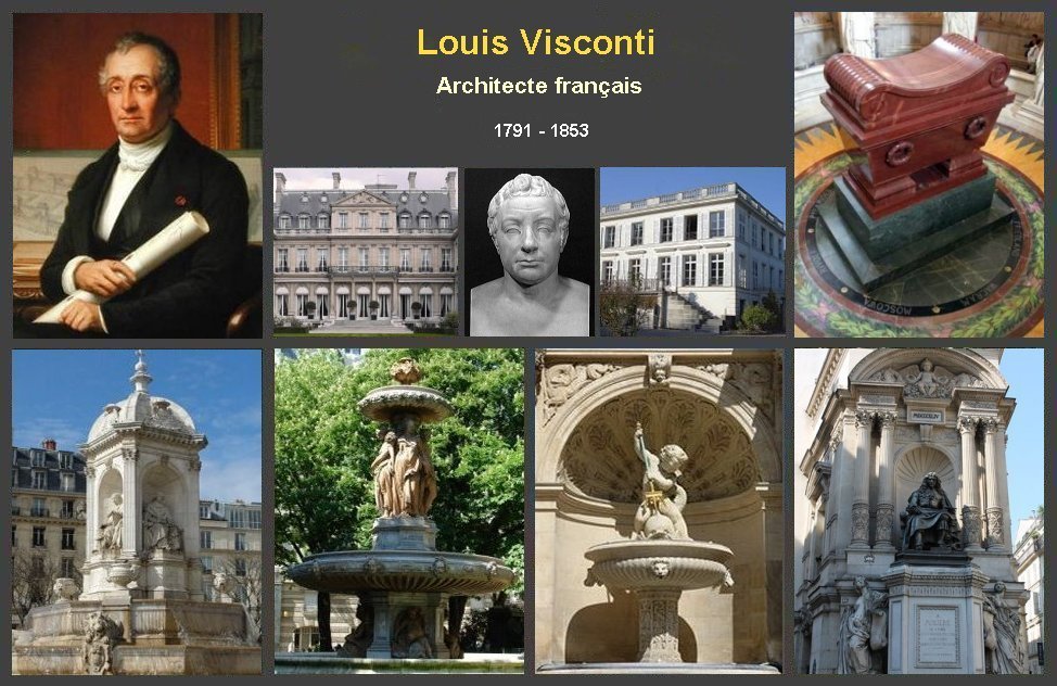 Brève biographie Louis Visconti architecte français est né le 11 février 1791 à Rome (Italie) Issu d'une célèbre famille d'archéologues en Italie, Sa famille s'installe à Paris en 1798 et il obtint la nationalité française en 1799 Son père est nommé conservateur des Antiquités et des Tableaux au Musée du Louvre Entre 1808 et 1817, il étudie à l’École des beaux-arts de Paris sous la direction de Charles Percier. Il obtient le second grand prix de Rome d'architecture en 1814. Il est nommé architecte du Palais des Tuileries en 1852 et architecte de l'empereur Napoléon III en 1853. Puis chargé de concevoir le projet de réunion du Palais du Louvre et du Palais des Tuileries réalisé par Hector Lefuel. Suite à son décès par crise cardiaque en 1853, le projet d'aménagement du Louvre est repris par Hector Lefuel. Louis Visconti est décédé à Paris le 29 décembre 1853